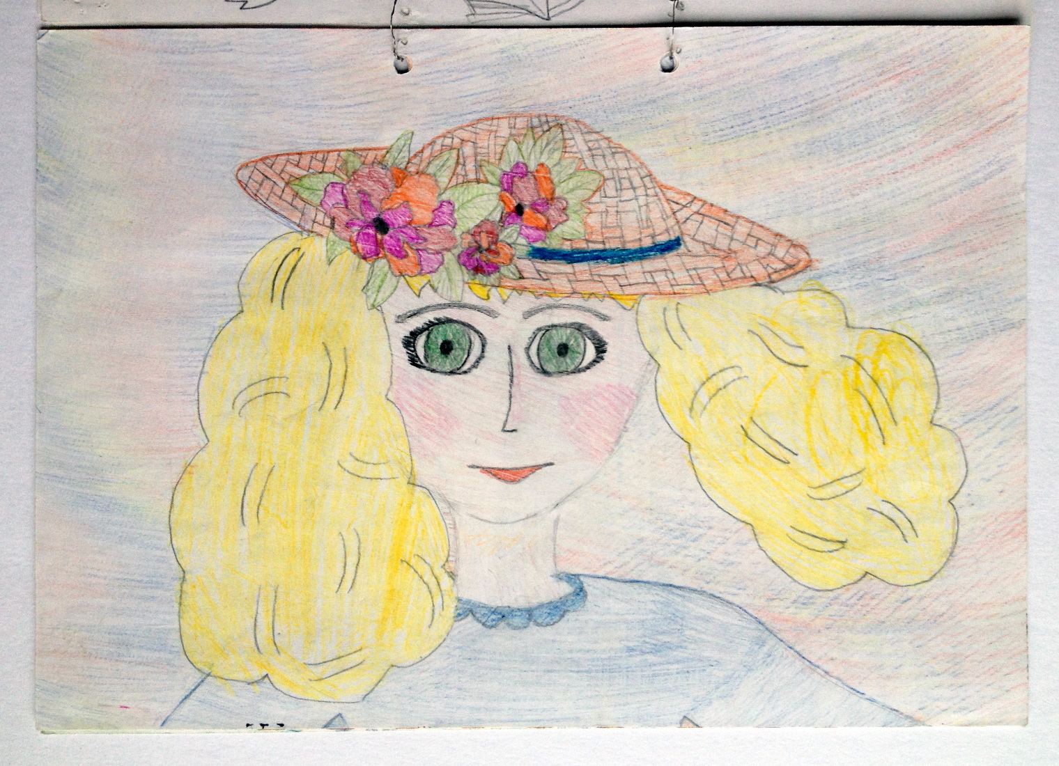Мне кажется, она тут красивая. Такие яркие зелёные глаза, аккуратные ресницы. Детально проработанная соломенная шляпка и украшающие её цветы. Вот этот рисунок и будет завершающим.